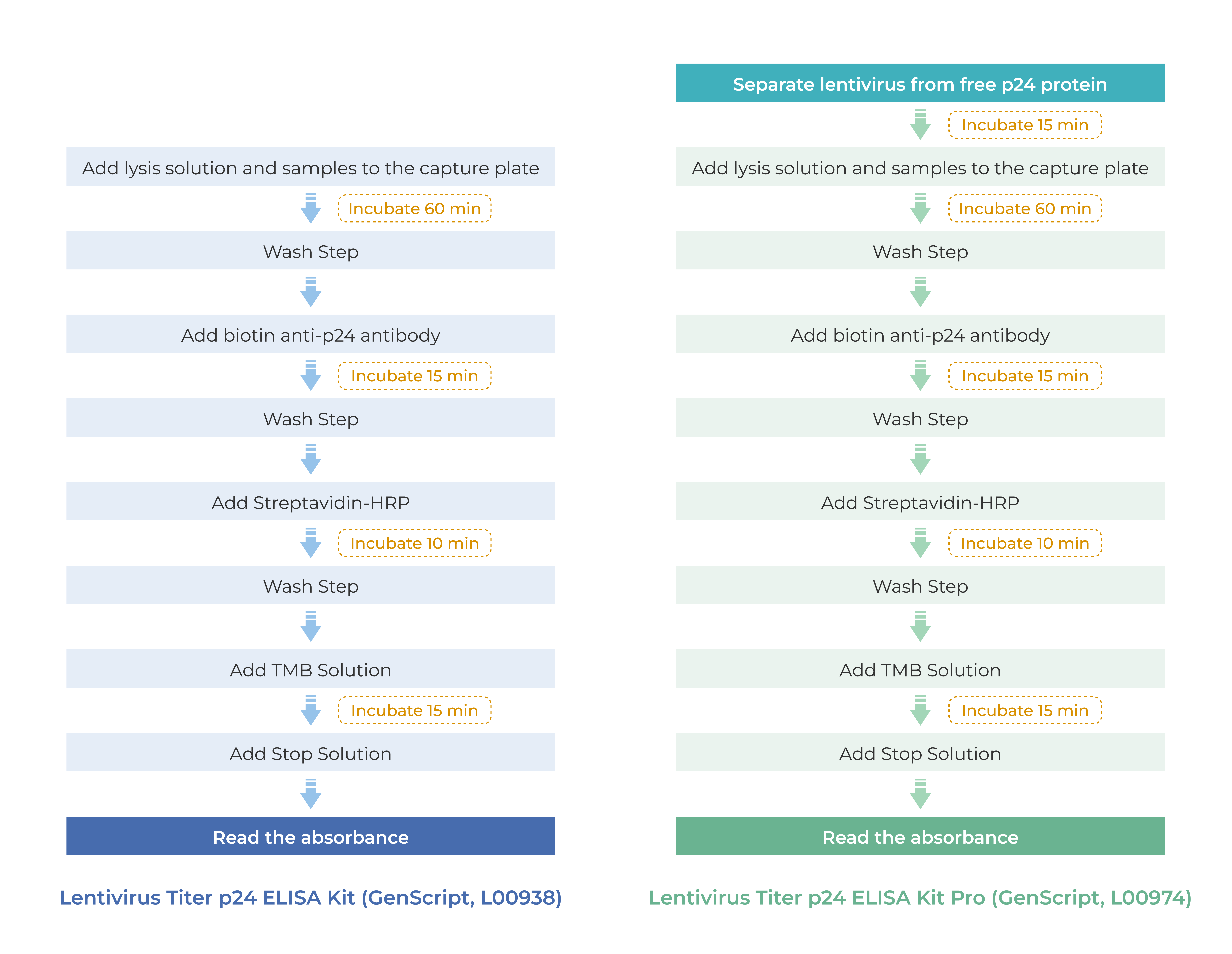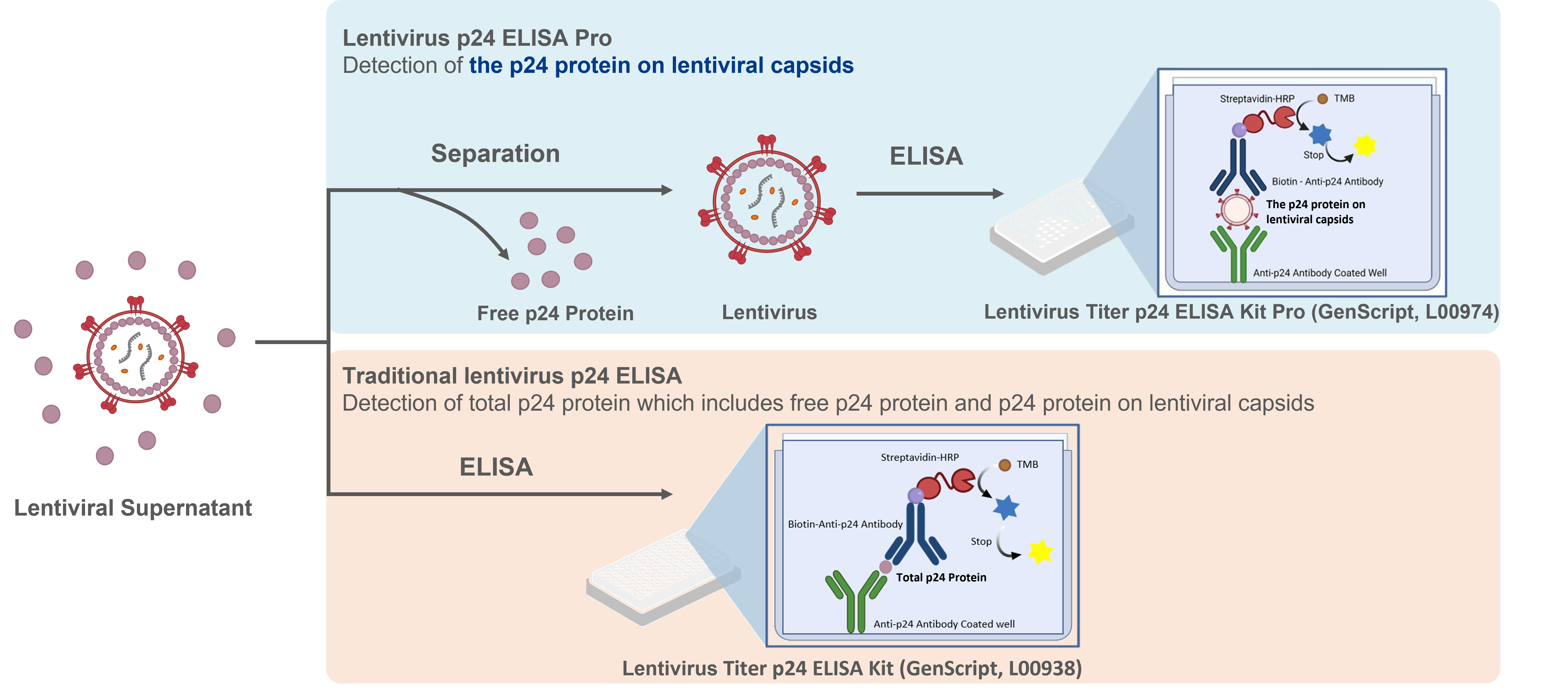 Lentivirus Titer p24 ELISA Kit Pro (GenScript, L00974), only detects p24 protein on the lentivirus capsid, not interfered by free p24 protein, and it takes about 3 hours to obtain results. Lentivirus Titer p24 ELISA Kit (GenScript, L00938) detects total p24 protein, including free p24 protein and p24 protein on the lentiviral capsid, and it takes about 2.5 hours to obtain results.